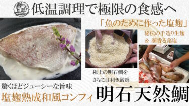 魚匠の逸品【魚匠の逸品】明石鯛の塩麹熟成和風コンフィ~魚のために作った塩麹による熟成と低温調理のなせる業 使用するのは、「日本一の鯛」と名高い明石の天然真鯛。潮流の速い明石海峡で育まれた鯛は、身が引き締まり、適度な脂が乗り、身は甘く風味が抜群。 魚匠は、その中でもさらに・鮮度はもちろん・肥え方や体型・色つやなどを厳選して使用。最高の鯛のポテンシ... 2025.11.16魚匠の逸品